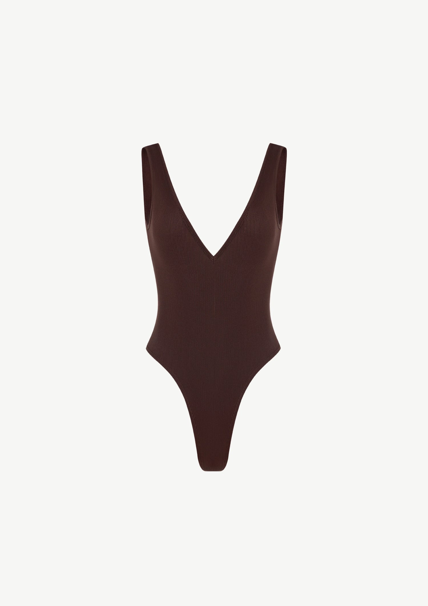 Made from soft, stretchy ribbed knit fabric, the bodysuit delicately accentuates the body’s curves. The deep V-neck adds flair, while the open back creates that signature touch to your look.